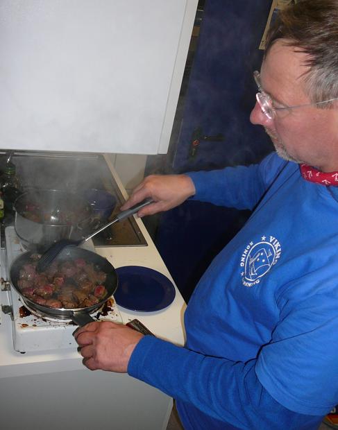 Wir kochen nicht immer auf dem Bootshallenboden. Hier beim Koblenzer Ruderclub Rhenania gibt es sogar eine kleine Küche in der Küchenchef Matze ein herzhaftes Gulasch zubereitet. |