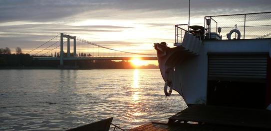 Auf dem Rhein zu rudern ist und bleibt etwas ganz besonderes! Hier die Anfahrt zum schwimmenden Bootshaus des Kölner Club für Wassersport. |