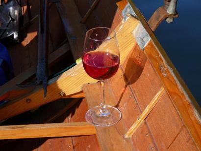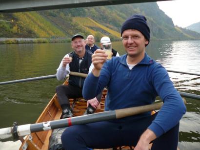 Dabei kommt aber auch eine Weinprobe nicht zu kurz. Hier ist es allerdings der beliebte Federweisse. Praktisch: Beim Riemenrudern hat man immer eine Hand frei fürs Glas... |