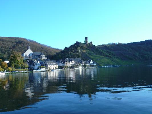 Das Wasser liegt in den Nachmittagsstunden wie Öl. Wir durchpflügen es mit ruhigem langem Schlag und nähern uns der Schleuse Fankel. In der Nachmittagssonne geniessen wir den Blick auf Burg Beilstein. Noch eine Stunde bis Cochem. |