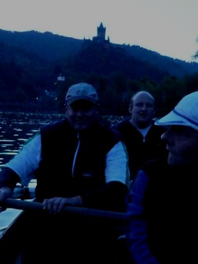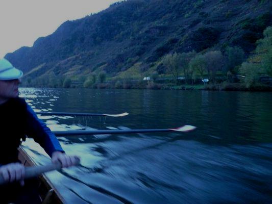 Die Dunkelheit wirft ihre Schatten voraus. Die letzten Kilometer nach Cochem mit letztem Licht. Konzentration. Ruhe. Die Mannschaft geniesst das glatte Wasser und die schnelle Fahrt. Der Herbstwind ist fast eingeschlafen. |